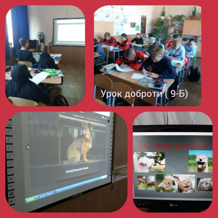 Учні долучилися до ІІ Всеукраїнського Уроку доброти про гуманне та відповідальне ставлення до тварин. На уроках вчителі обговорили з учнями важливі питання ставлення та піклування про тварин. Учні 9-Б класу підготували факти про історію Дня захисту тварин та розглянули його логотип. У 7-А класі було проведено Урок добра “Де сховатися бездомним від бездушних та байдужих?”, на якому була розглянута проблема безпритульних тварин як соціальне питання сьогодення. Учні виклали власне ставлення до людської доброти у малюнках..У 10-А класі учні долучилися до диспуту “Безпритульні тварини. Чи мають шанс на життя” про шляхи вирішення проблеми та довели, що в Україні питання захисту тварин актуальне, як і у багатьох країнах світу, де захисники тварин гуртуються аби нагадати мільярдам людей що права тварин треба захищати.