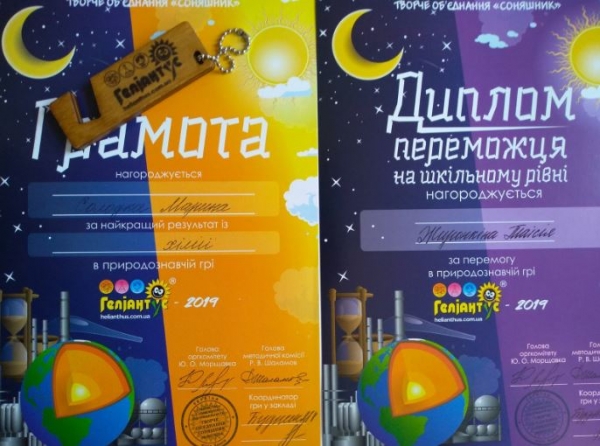 Вітаємо участників міжнародної гри "Геліантус" серед учнів 6- 10 класів та юну переможницю, ученицю 6-А класу Солодку Марину в номінації "Хімія".