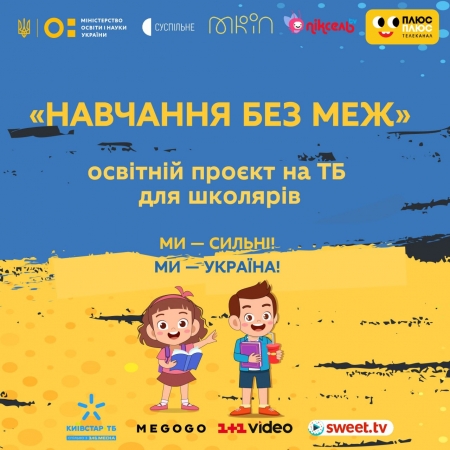У понеділок, 14 березня, стартує «Навчання без меж» – спільний освітній проєкт Міністерства освіти і науки України, Міністерства культури та інформаційної політики, українських телеканалів ПЛЮСПЛЮС, «Піксель» та регіональних каналів Суспільного мовника, а також платформ онлайн-телебачення MEGOGO, Київстар ТБ, 1+1 video та sweet.tv.